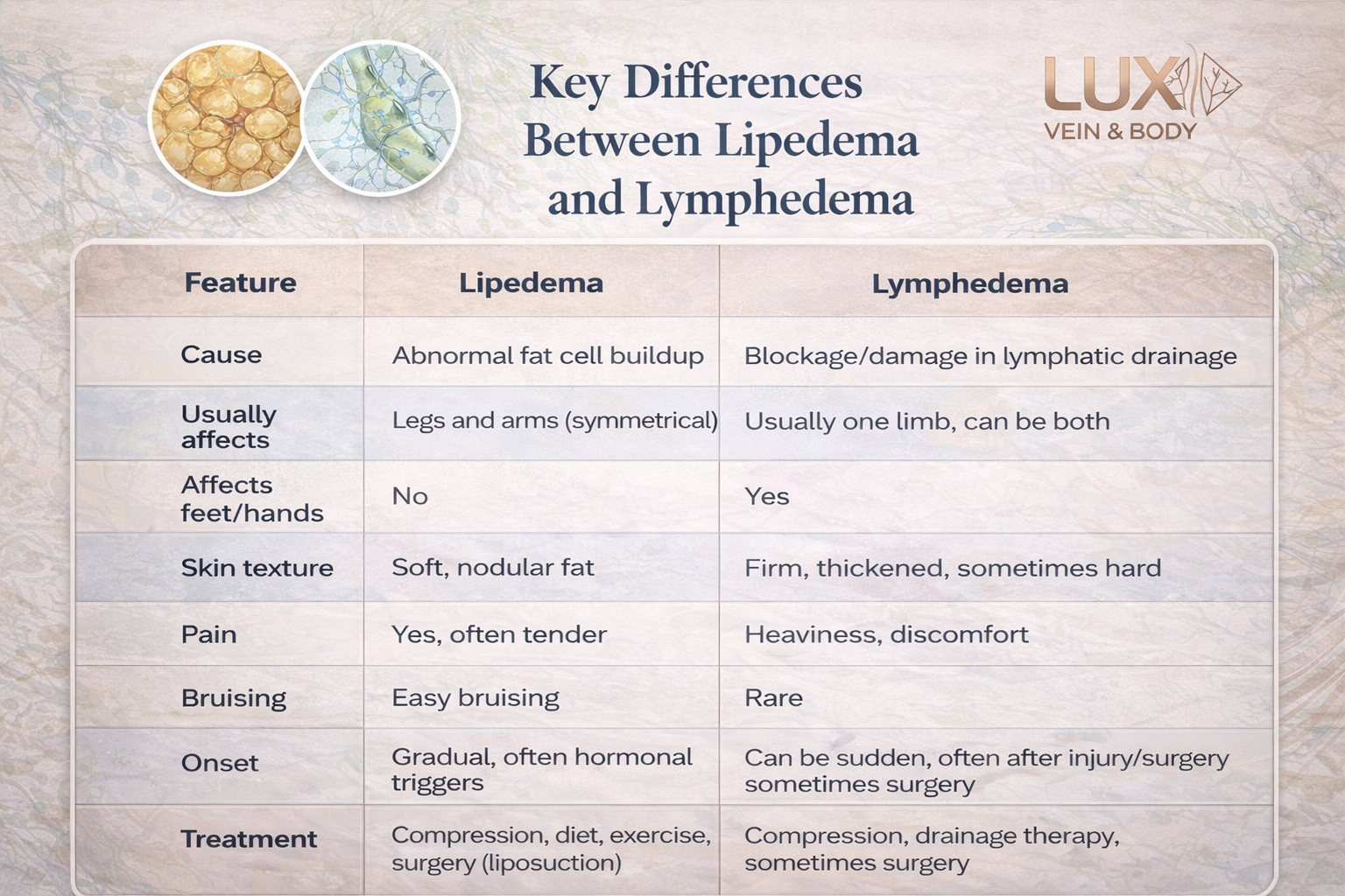 While lipedema vs lymphedema differences both involve swelling, they are caused by different issues and have distinct signs. Understanding lipedema vs lymphedema differences helps patients avoid misdiagnosis.